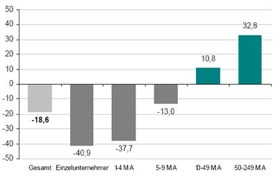 Auf dem BDS-Kreditbarometer ( Graphik 3 ) ist deutlich zu erkennen, wie Unternehmensgröße und Kreditzugang zusammenhängen. Je größer ein Unternehmen, desto leichter der Kreditzugang. Dementsprechend erreichen die großen Mittelständler über 50 Mitarbeitern mit 32,8 Punkten den höchsten Wert, während die Einzelunternehmer mit minus 40,9 Punkten die meisten Schwierigkeiten haben, einen Kredit zu bekommen.