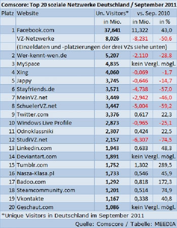 Bei unserem Ranking haben wir uns streng an die Comscore-Rubrizierung gehalten. Sprich: Nur Websites, die Comscore unter "Social Media - Social Networking" einteilt, kommen in die Wertung. Das führt zu Ungereimtheiten, wie z.B. die Aufnahme von Geschaut.com, einer Seite, die populäre Facebook-Sprüche veröffentlicht, aber kein soziales Netzwerk ist. Andere Angebote wie Flickr, die MEEDIA durchaus als soziales Netzwerk einordnen würde, fehlen dafür.